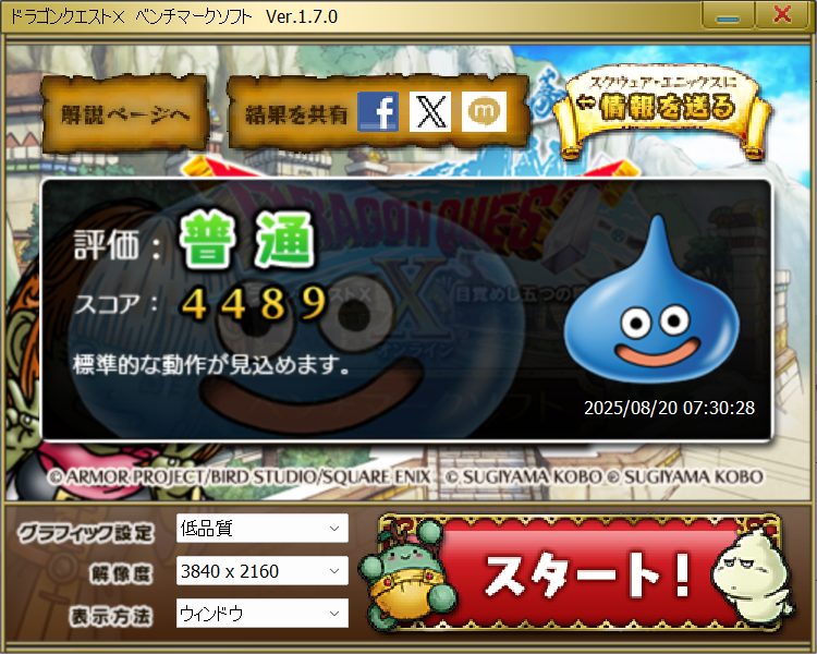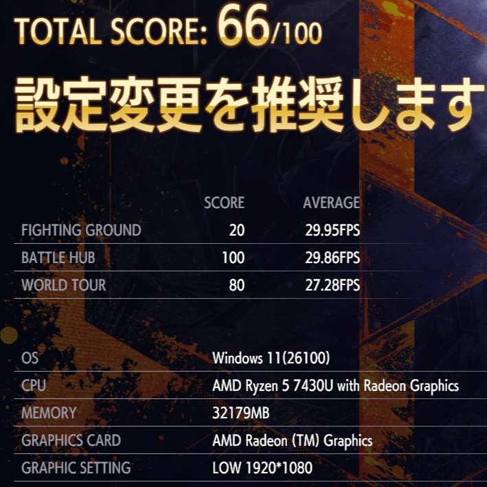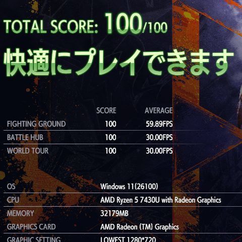 実際のゲームを遊ぶ場合は解像度とグラフィック品質を下げれば遊べるとネット上の情報でありました。