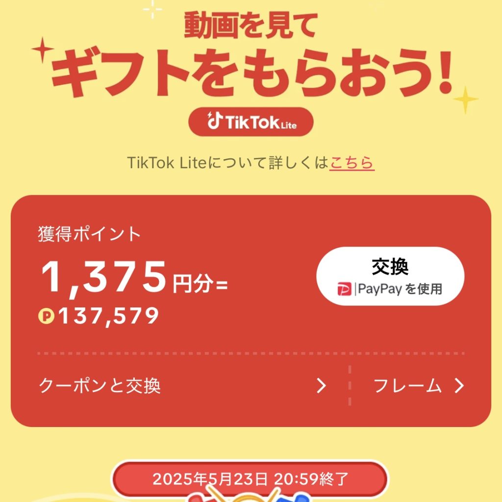 - TikTok Liteは動画や広告視聴で稼げるポイ活アプリ