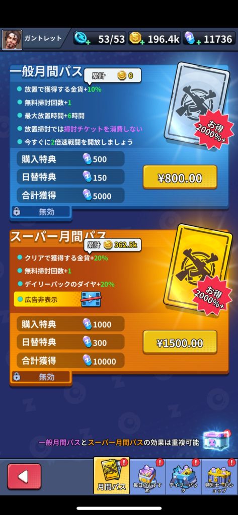 • 一般月間パス:ゲーム内戦闘を2倍速にできるため、プレイ時間を大幅に短縮できます。また、プレイ中にパスの内容がアップデートされ、「掃討」機能がスタミナ消費のみで利用可能になり、さらに利便性が向上しました。