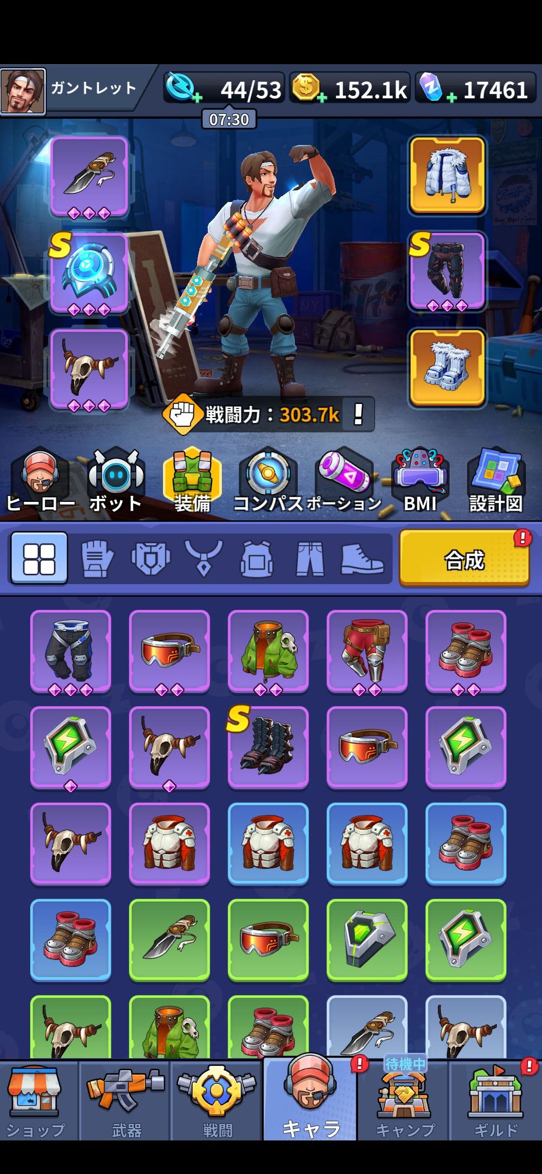 • 装備:「クイック合成」を活用し、積極的に合成してより強力な装備を目指します。筆者の場合は攻撃力を最優先し、雑魚の足止めと一掃を狙って極寒系の効果を持つ装備を重視しました。 注意点として、紫レアリティのS装備★3よりも、橙レアリティの通常装備の方が強力です。例えば、S装備の靴が1つしかなかった場合、それを★3まで強化して使用しつつ、紫の通常装備★3の靴が作成可能になった時点でS装備を「降格」させて素材を回収し、紫の通常装備★3を2つ作成。それらを合成して橙の通常装備を作成・使用するといった柔軟な対応が求められます。(S装備はS装備同士でしか合成できないため)