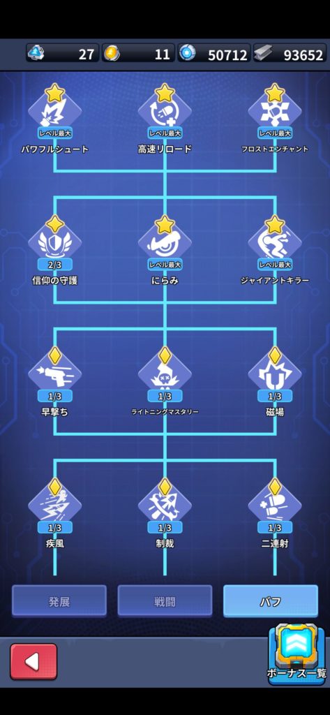 • バフ:筆者は「生命力」と下記画像の項目を優先してレベル最大にしました。自身のプレイスタイルや不足している能力を補う形で強化するのが良いでしょう。