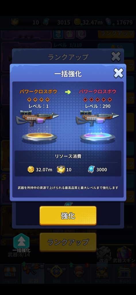 武器は、基本的に武器画面の上から順に、ステージクリア報酬として入手できるものを使っていきます。「一括武器変更」ボタンで強化状態を引き継げるため、使用する武器は惜しみなく強化しましょう。(強化素材だけ回収したい場合は、強化済み武器にある「初期化」ボタンを利用する)