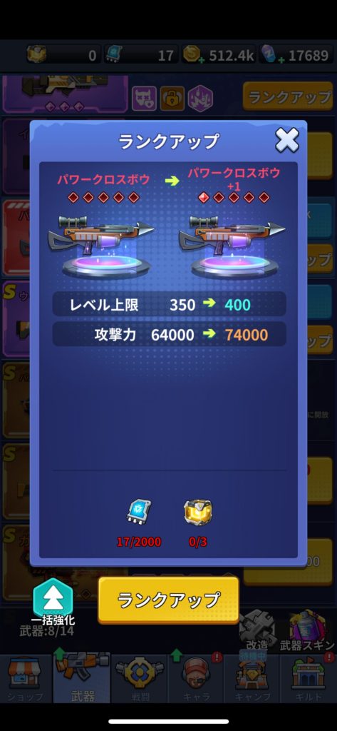 赤色にランクアップする武器は、強化素材が比較的少ない「パワークロスボウ」がおすすめです。これはステージ35クリアで取得できます。
