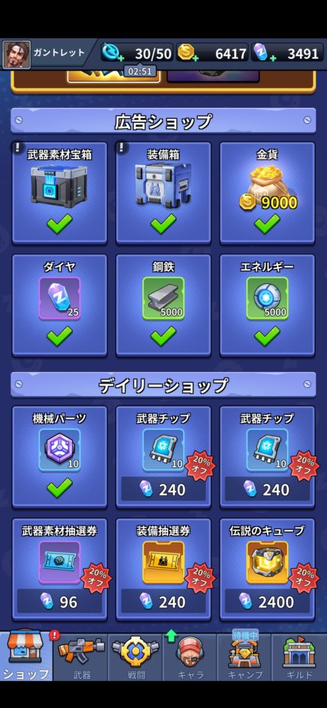 筆者は、武器、装備、ボットのガチャをそれぞれ20回程度ずつ回し、その後は15日目あたりからデイリーショップで割引されているアイテムを全て購入するようにしました。時折、スタミナ回復にもダイヤを使用しました。それでも最終的に11000個程度のダイヤが余りました。